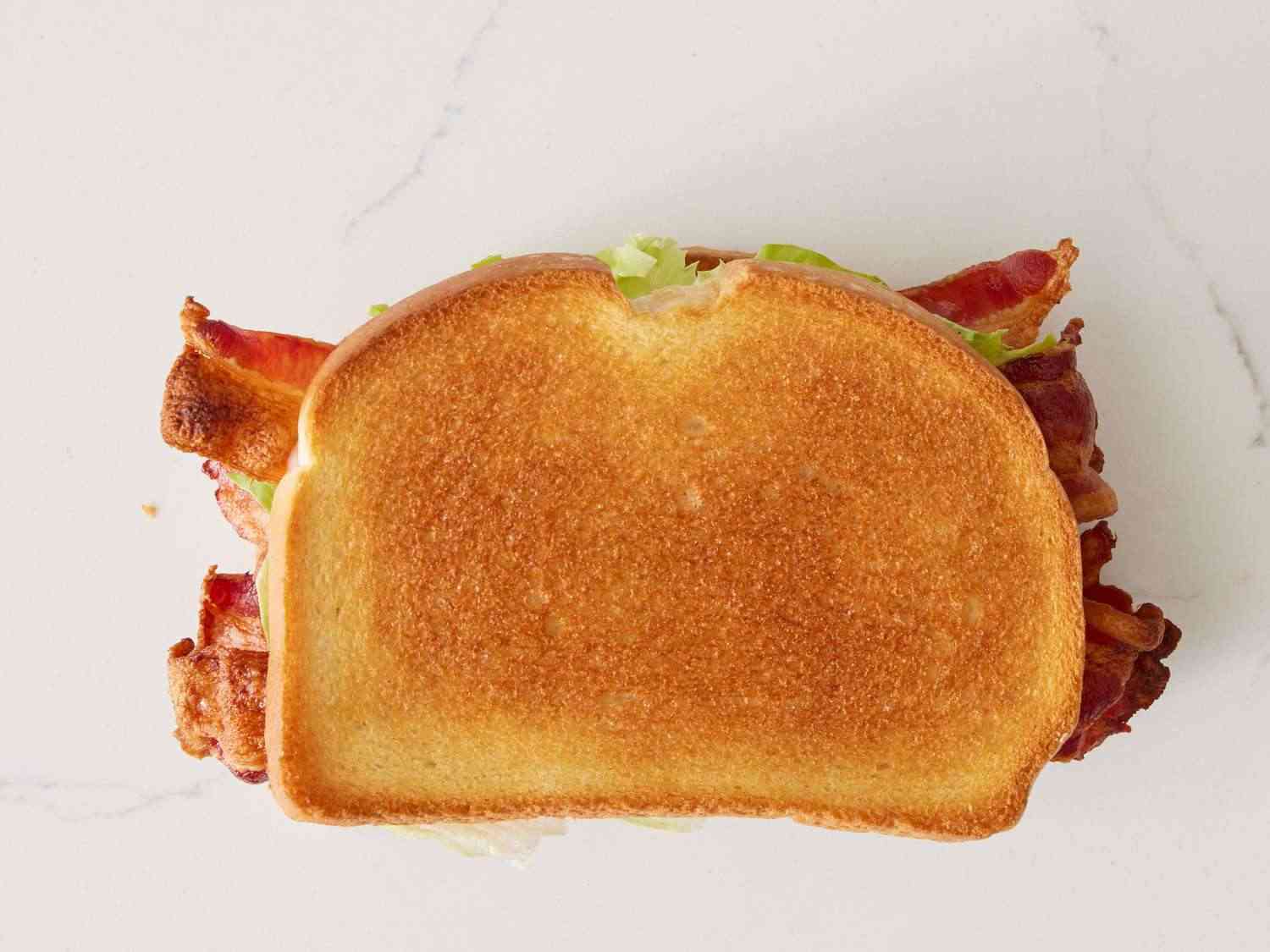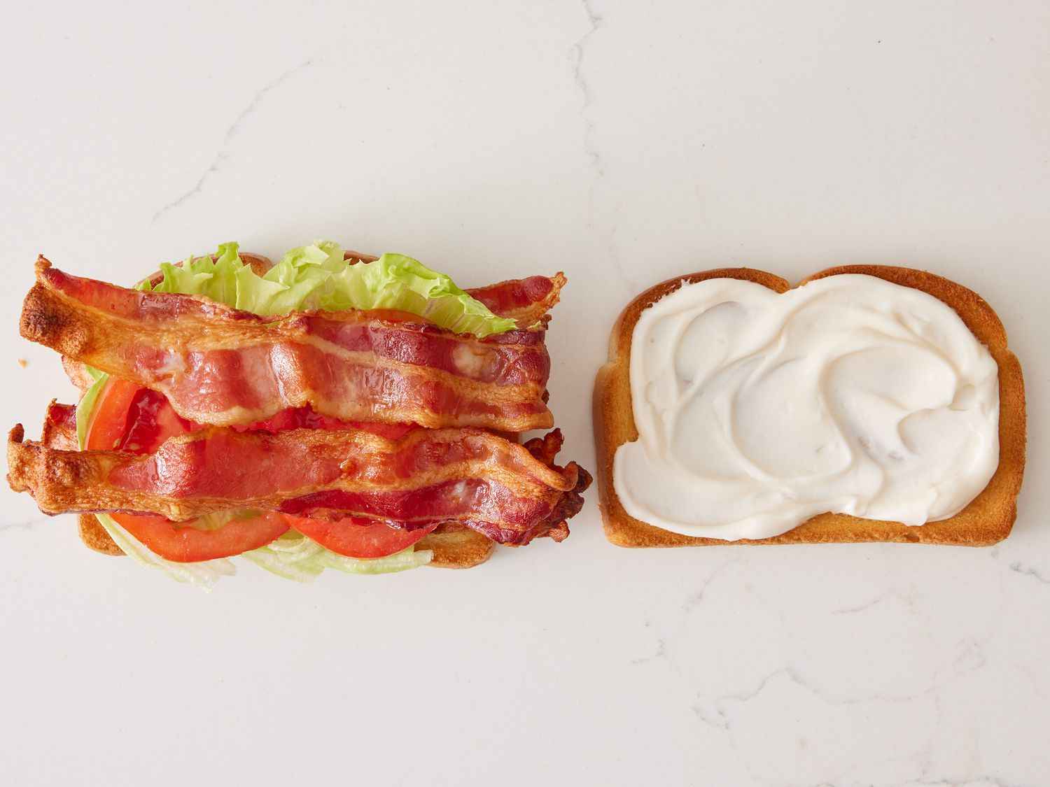 - Step 3:Arrange cooked bacon, lettuce, and tomato slices on one slice of bread. Spread mayonnaise on the other slice of bread. Dotdash Meredith Food Studios